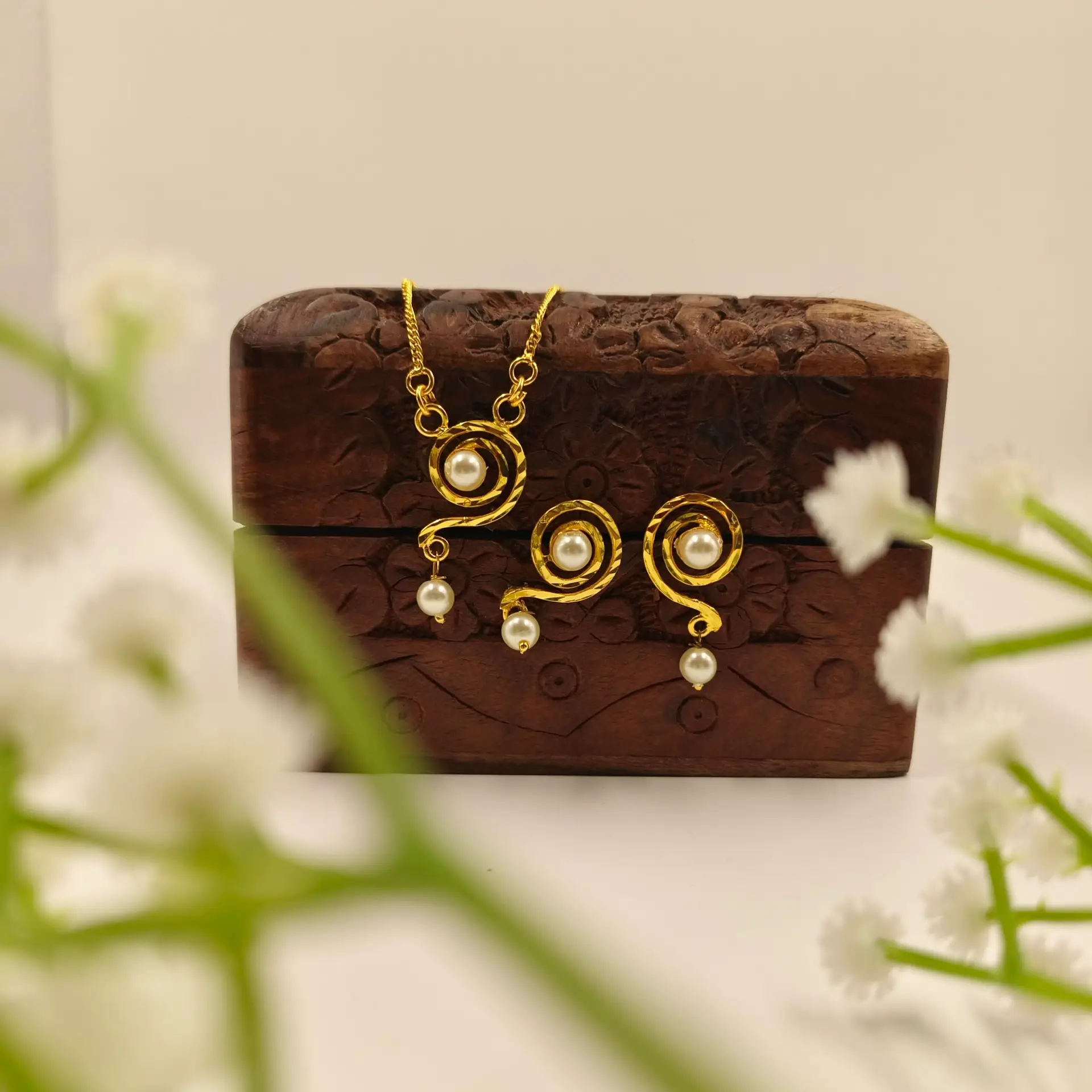 Elegant pearl drop chain locket set with matching earrings