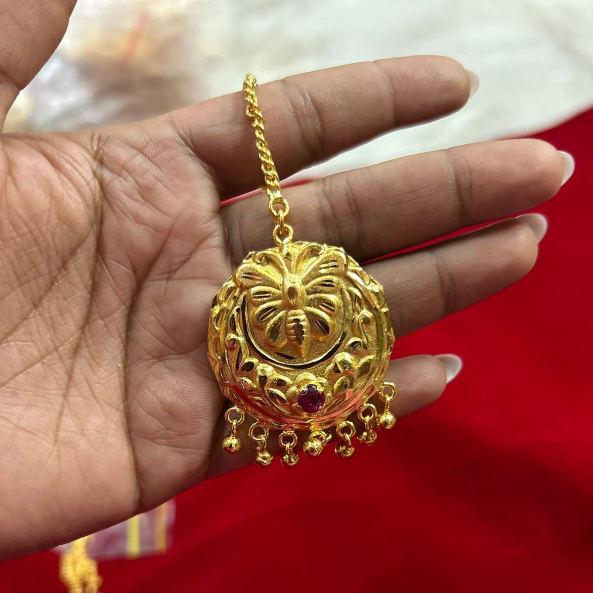 24kt gold-plated tikli with elegant traditional design. Includes 2-year warranty. Perfect for bridal and festive wear.